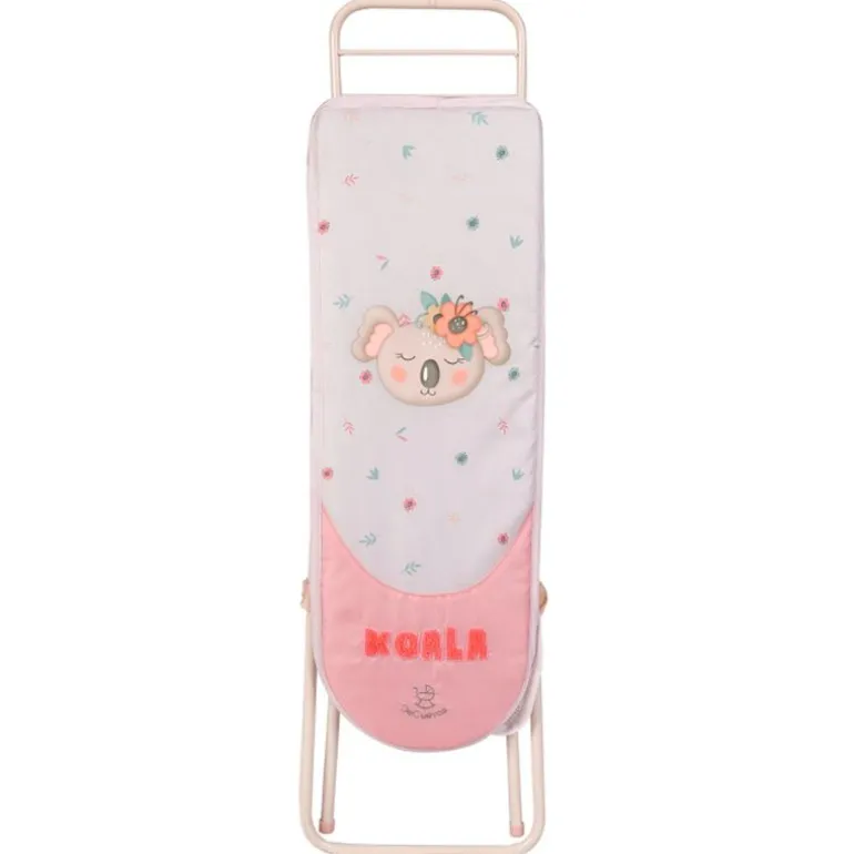 Planchador de color blanco y rosa con diseño especial de la línea Koala, estructura plegable, bandeja de tela inferior, una plancha de juguete y 3 perchas de plástico. El planchador tiene una altura de 63 cm de alto (regulable a 50 y 60 cm), 72 cm de ancho y 25 cm de fondo. Recomendado a partir de 3 años.