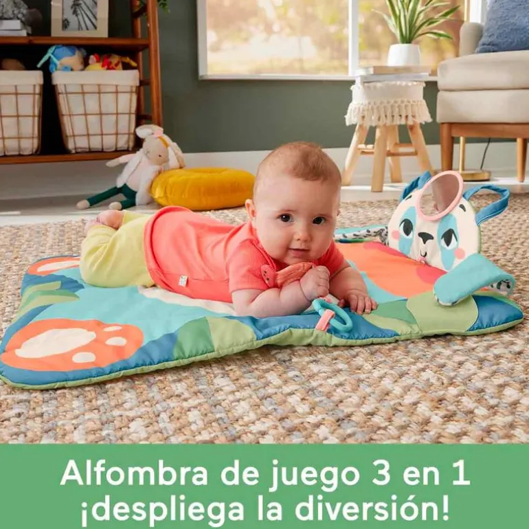 Gran alfombra portátil de panda con actividades para bebés 3 en 1 para jugar boca abajo, boca arriba o en viajes. Cuenta con un panel de alto contraste para jugar boca abajo, un juguete que cruje al arrugarlo y un espejo de auto-reconocimiento que puede engancharse para activar el juego sensorial. Ideal para el desarrollo de la motricidad gruesa, habilidades sensoriales, autodescubrimiento, desarrollo visual, seguridad y felicidad. Inspirada en animales destacados por WWF, la alfombra de juego de panda balanceante utiliza tejido hecho con un 90% de plástico reciclado tras el consumo. Recomendado a partir de 0 meses.
