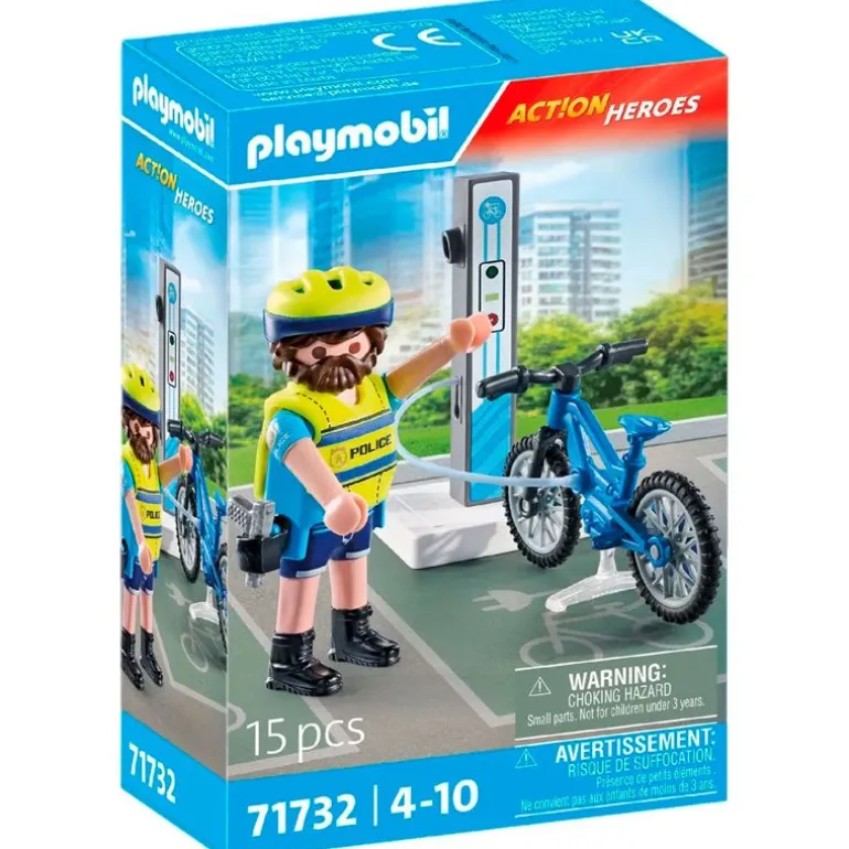 ¡Corre a toda velocidad por la ciudad con la patrulla en bicicleta de Playmobil! Equipada con una bicicleta eléctrica y una estación de carga. El casco del policía es extraíble, mientras que el soporte de la bicicleta garantiza que siempre esté libre para la siguiente misión.