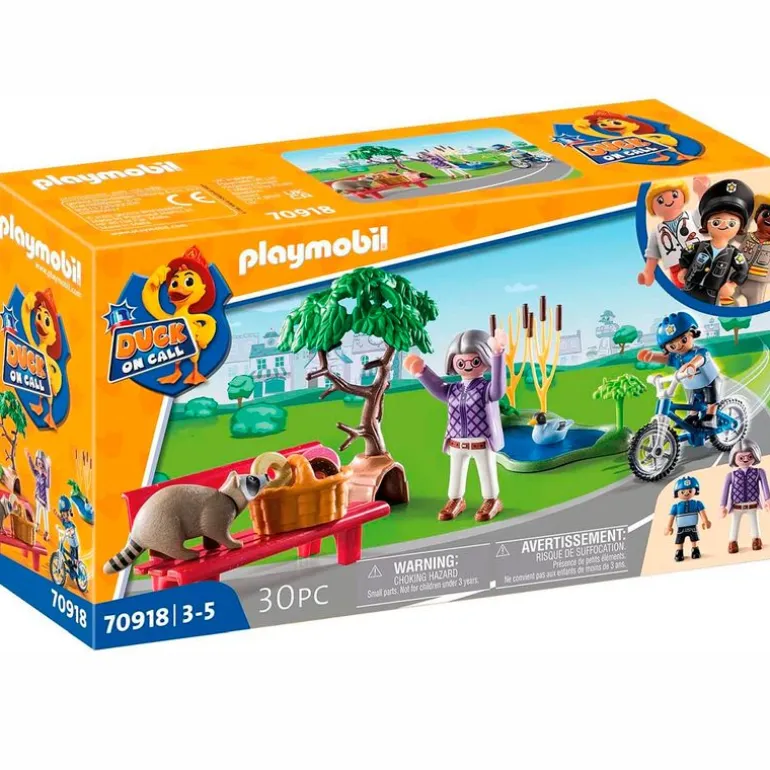 Pack de la colección Playmobil Duck on Call! En el que encontrarás un árbol con guarida de mapache, un mapache, una figura de un niño con bicicleta, una abuelita, un estanque de patos, un banco y más. Recomendado a partir de 3 años.