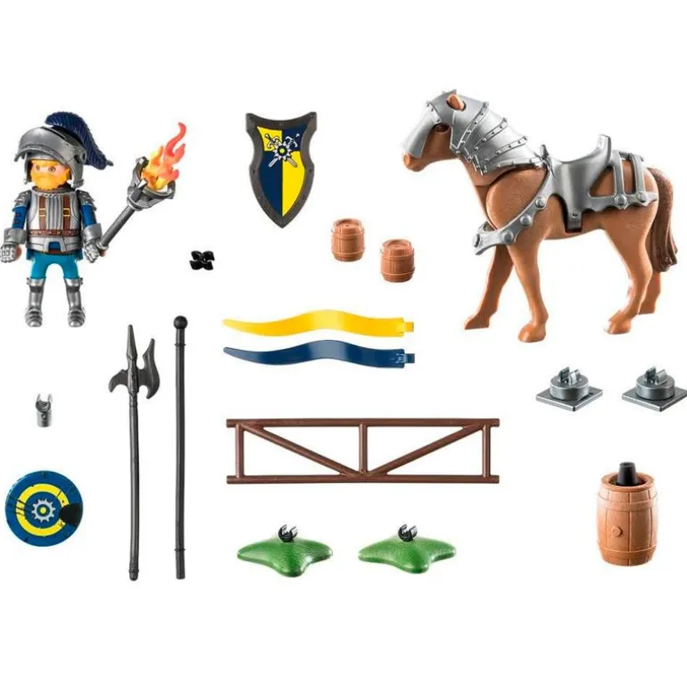 Pack de la colección Playmobil Novelmore en el que encontrarás un caballero medieval preparado para un torneo. Viene acompañado de un caballo, un mástil de bandera, banderas, barriles, una lanza y otros complementos. Recomendado a partir de 4 años.