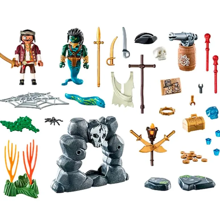 Pack búsqueda del tesoro de la colección Playmobil Pirates en el que encontrarás un escondite rocoso con una puerta móvil de telaraña, 2 piedras con marcadores de camino, un cañón funcional y muchos accesorios. Contiene 2 figuras de la colección Playmobil. Recomendado a partir de 4 años.