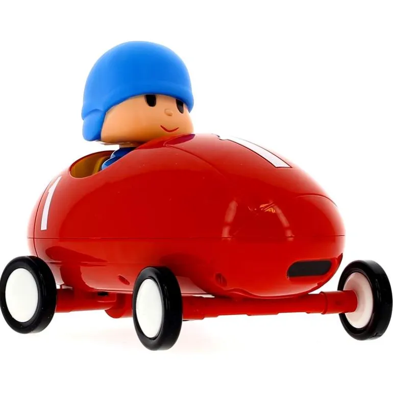 El coche de carreras rojo de Pocoyó va hacia delante, hacia atrás y al chocar cambia de dirección. Mientras el coche se mueve emite simpáticas melodías y, si pulsas la cabeza de Pocoyó, el coche y la música aumentarán su velocidad. ¡Pásalo en grande con Pocoyó! También puede funcionar en silencio.