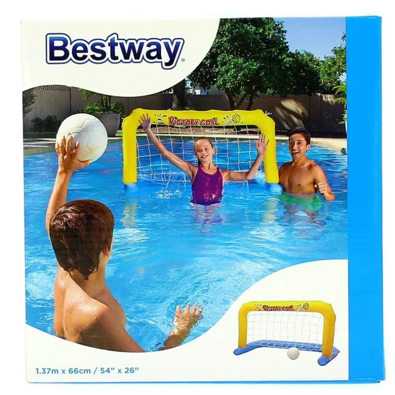 Portería hinchable con pelota para usar en la piscina y disfrutar del deporte mientras te refrescas. Medidas: 71 x 137 x 67 cm, aproximadamente.
