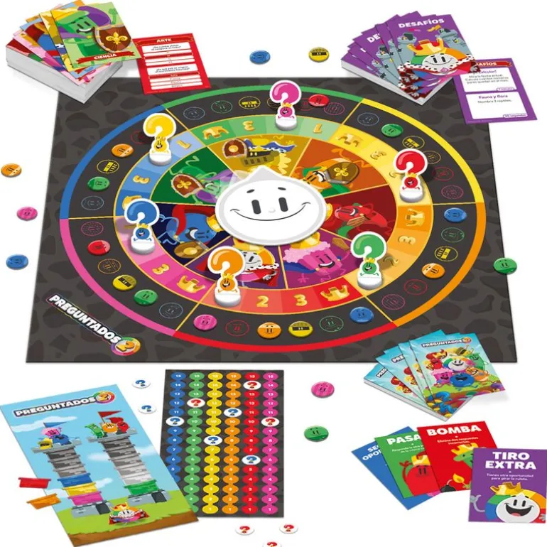 Contiene un tablero con ruleta, un tablero de duelo, un tablero de puntuación, 270 tarjetas de preguntas, 54 tarjetas de desafío, 24 tarjetas de comodín, 36 fichas de categorías, 12 fichas de puntuación, 6 fichas de torre, 6 peones y las instrucciones del juego.