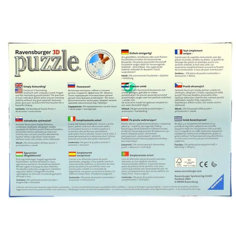 Puzzle en 3D del impresionante y visitado Palacio de Buckingham, la residencia oficial de la Reina Isabel II. Se compone de 216 piezas que se ajustan perfectamente entre sí, por lo que el montaje no necesita de colas ni pegamentos.