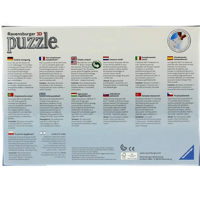 Puzzle en 3D de la mítica y clásica furgoneta de Volkswagen, el modelo California. Ayuda a mejorar la memoria, la concentración, la resolución de problemas, y la paciencia, al tiempo que reducen el estrés y fomentan la creatividad.
