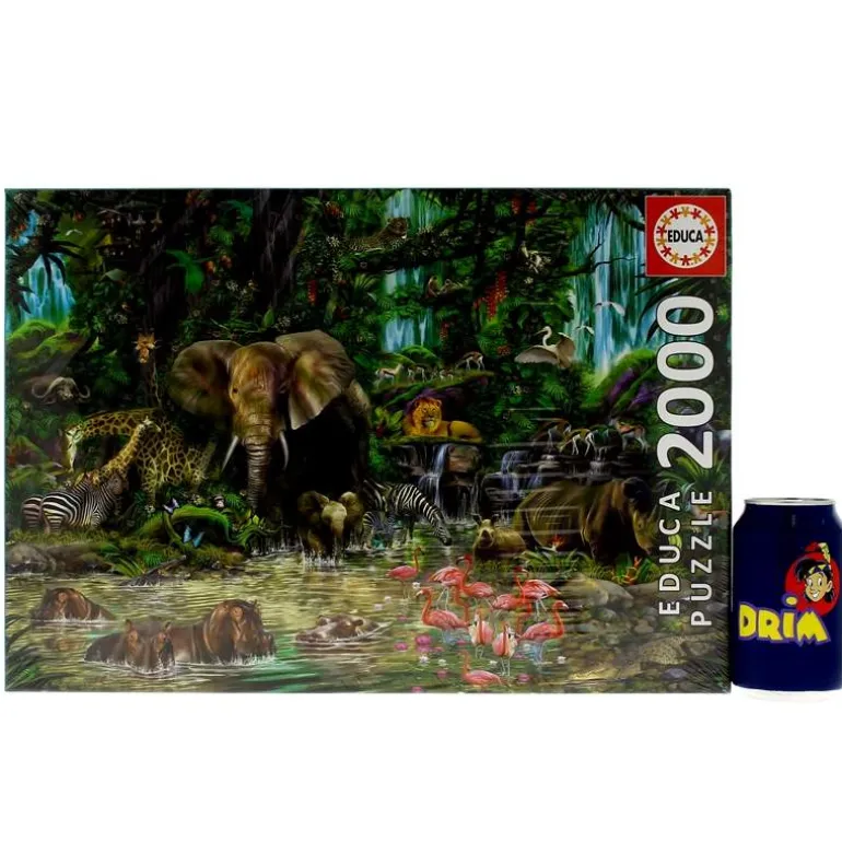 Puzzle de 2000 piezas con una impresionante imagen de un grupo de animales en la jungla africana. Medidas aproximadas del puzzle montado: 68 x 96 cm.