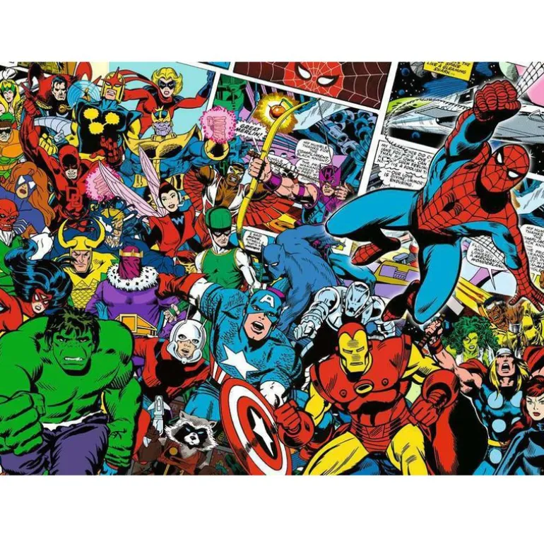 Un puzzle que representa los personajes Marvel tiene 1000 piezas y una vez terminado mide 70 x 50 cm.