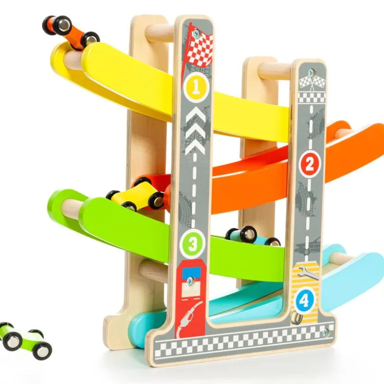 Rampa de coches fabricada en madera para los más pequeños de la casa. Contiene 4 coches para comenzar a jugar. Sus dimensiones son de 30.5 cm x 28.3 cm x 8.8 cm aproximadamente. Recomendado a partir de 12 meses.