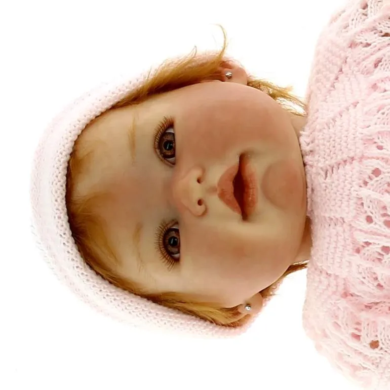 La carita de este bebé Reborn refleja felicidad y dulzura en unos grandes ojos muy expresivos. Va vestida con un traje de perlé en color rosa con gorro (chambreta + polaina).