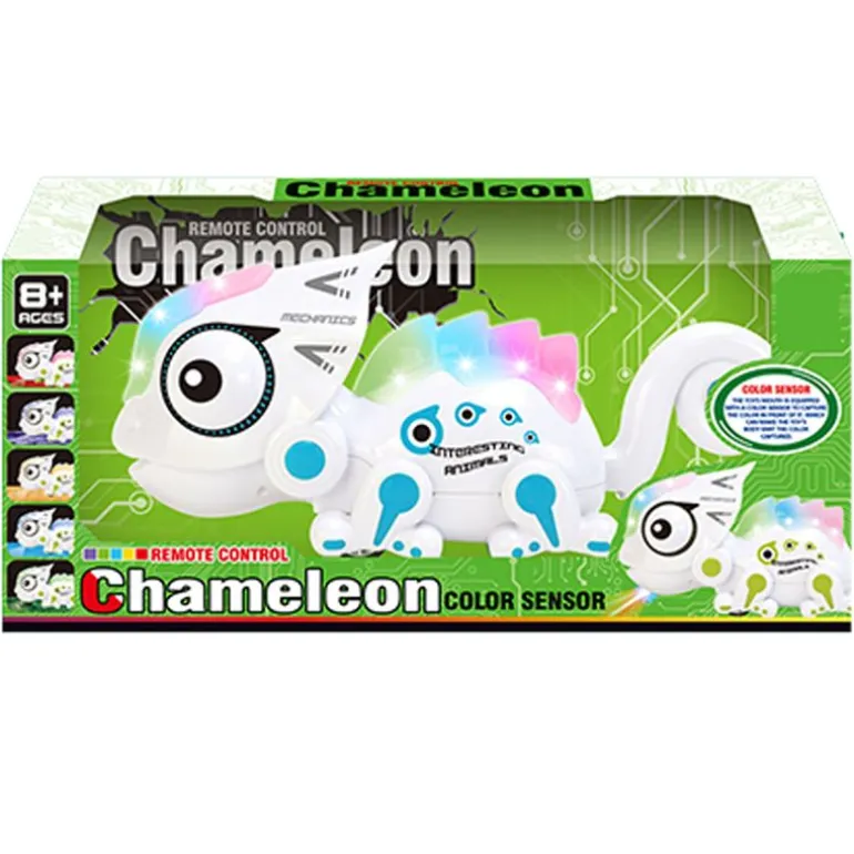 Camaleón radiocontrol con sensor de color. La boca del camaleón está equipada con un sensor que captura el color del objeto que tenga delante y cambiará de color su cuerpo acorde al color que captura. Podrás moverlo en diferentes direcciones gracias al mando que lo acompaña. Funciona con batería incluida y 2 pilas AA NO incluidas. Recomendado a partir de 8 años.