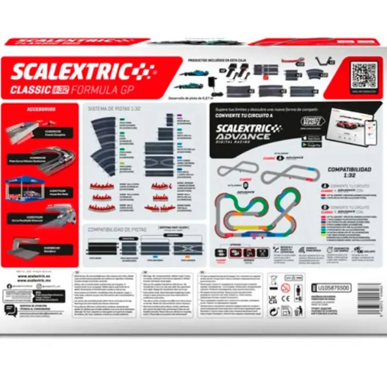 Contiene tramos rectos y curvas para formar un circuito dinámico, 2 coches tipo Fórmula 1 con gran nivel de detalle, mandos de velocidad manuales, fuente de alimentación incluida. Gracias a su formato ampliable, puedes personalizar el trazado con más pistas, cruces, loopings y accesorios Scalextric. ¡Cada carrera será diferente!