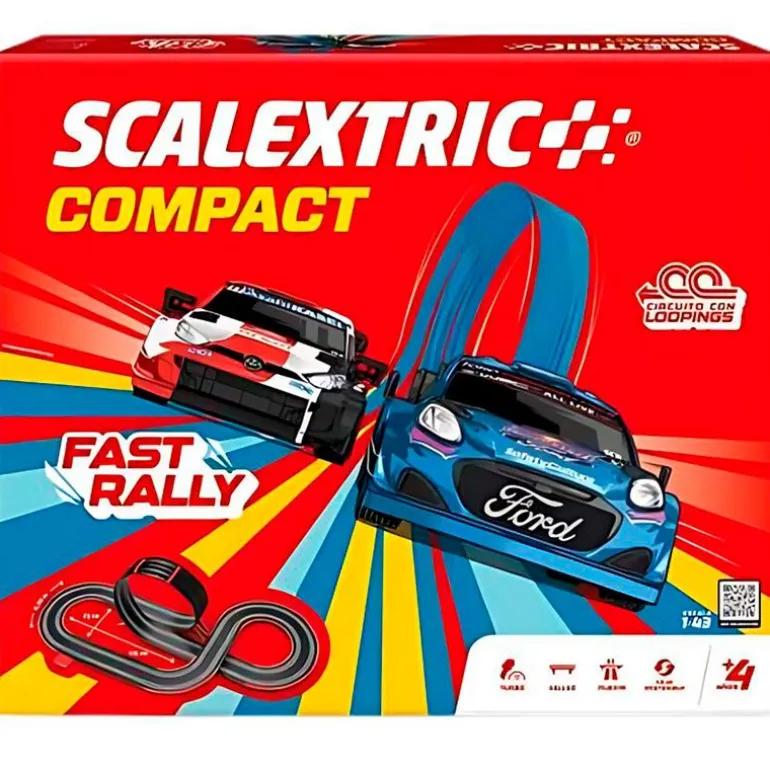 Pista de slot Fast Rally de la colección Scalextric Compact, que combina rectas rápidas con curvas técnicas para poner a prueba los reflejos y habilidades de cada piloto.