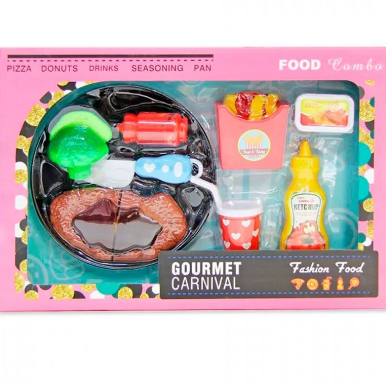 En el interior encontrarás diferentes accesorios con los que organizar una divertida barbacoa, como un bistec, brócoli, patatas fritas y salsas.