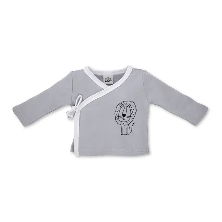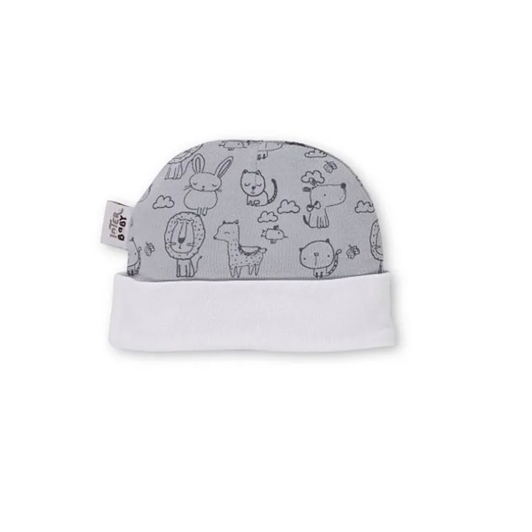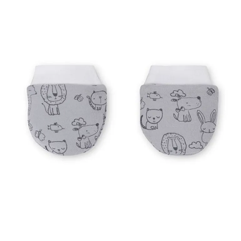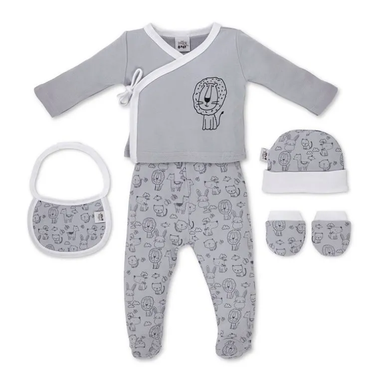 Set de nacimiento 5 piezas con animalitos ideal para hacer un regalo de 0-6m, formado por un babero, una camiseta cruzada, unos pantalones con pies, un gorro y unas manoplas.