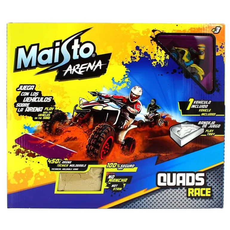 Diviértete con este set donde construirás una increíble mini pista de arena, podrás hacer vibrantes carreras y todo tipo de acrobacias con el fantástico quad. Incluye bandeja de 29×34 cm, arena moldeable 450 g (No mancha y no se mezcla con agua), quad de aluminio y pegatinas.
