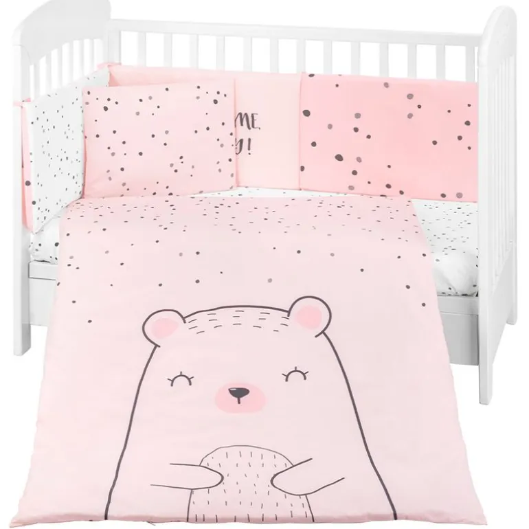 Este set de sábanas está compuesto por una almohada, funda de almohada, funda nórdica, relleno, bajera ajustable y protector de cuna (chichonera).