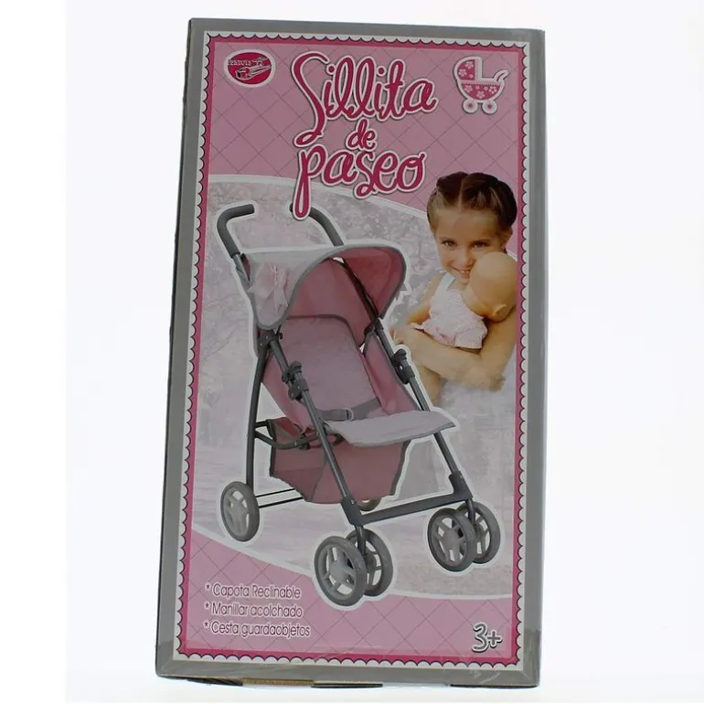 Silla de paseo plegable para muñecas en color rosa decorada con un bonito lazo. La sillita está acolchada y cuenta con capota, cestilla y ruedas delanteras que giran 360 grados.La sillita de muñecas se puede reclinar en dos posiciones. La silla tiene plegado tipo libro. La sillita mide 72x38x62 cm, aproximadamente.