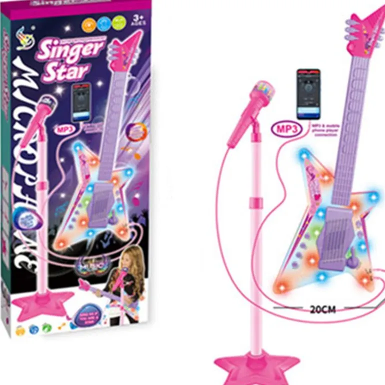 Viene acompañada de un micrófono para que puedan cantar que incorpora cable para que puedan acoplarlo tanto a la guitarra como a un dispositivo MP3 (NO INCLUIDO) para reproducir música.