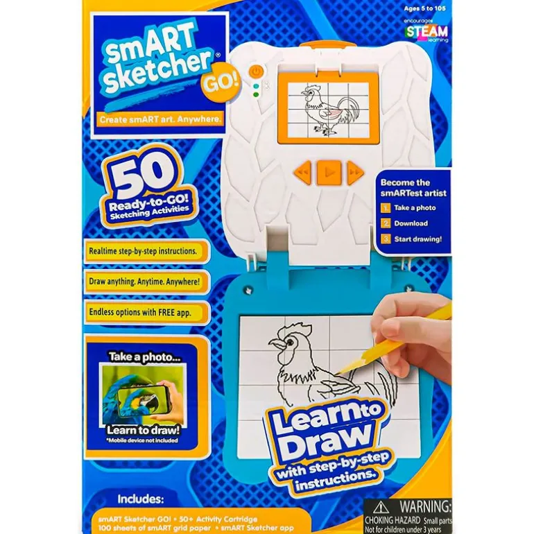 Smart Sketcher GO! es un dispositivo portátil que te permitirá dibujar paso a paso allá donde estés. La pantalla y el papel para dibujar están divididos en cuadrículas para hacer el proceso fácil y sencillo. Al seleccionar el dibujo, aparecerá en la pantalla el primer paso y cuando lo completes podrás pasar al siguiente ¡Aprende a dibujar con las imágenes prediseñadas de la tarjeta o cualquier fotografía de tu propio Smartphone o Tablet! Solo tendrás que descargar la App. Se conecta gracias al Bluetooth. En el interior de la tarjeta vienen vinculadas 50 actividades diferentes. Funciona con 4 pilas AA incluidas (pilas de demostración). Recomendado a partir de 5 años.