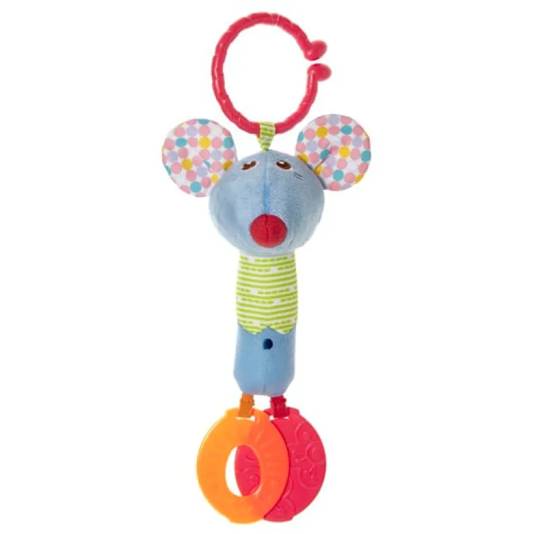 Un peluche sonajero muy suave al tacto que se puede colgar fácilmente al carrito o la cuna. Consta de partes de plástico para aliviar el periodo de dentición, y al apretar el cuerpo del ratoncito se puede escuchar sonido. Se puede lavar a máquina.