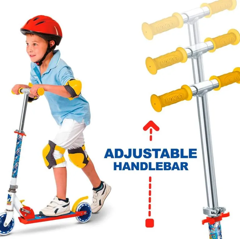 Patinete de 2 ruedas, fabricado en aluminio, con llamativos diseños inspirados en el videojuego Sonic. Dispone de freno en su parte trasera y es plegable. Su manillar es ajustable en altura de 68 cm a 77.5 cm aproximadamente. Soporta un peso máximo de 50 kg. Recomendado a partir de 5 años.