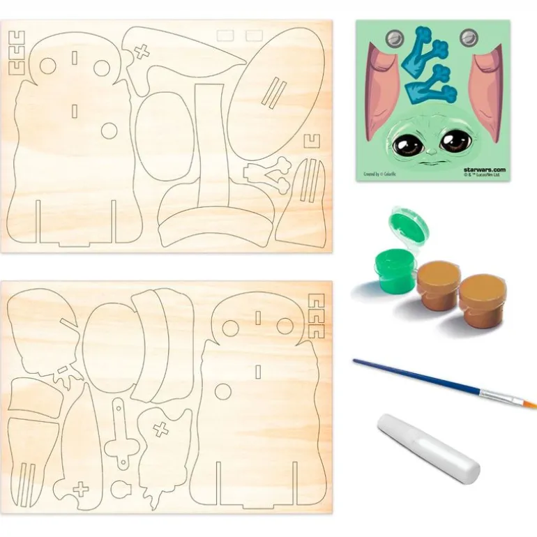 Maqueta de madera para pintar a tu personaje favorito de la serie de Disney + The Mandalorian, Baby Yoda. Está compuesta de 20 piezas e incluye 3 pinturas, un pincel, pegatinas, pegamento y las instrucciones. Recomendado a partir de 7 años.