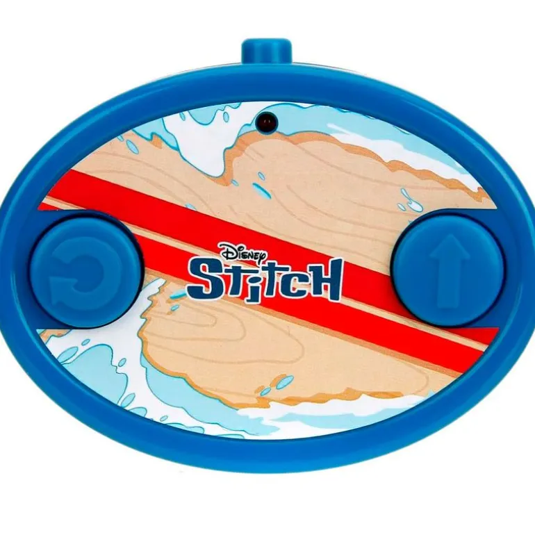 Divertido y colorido vehículo de radiocontrol inspirado en el personaje de Disney, Stitch, subido sobre su tabla de surf.