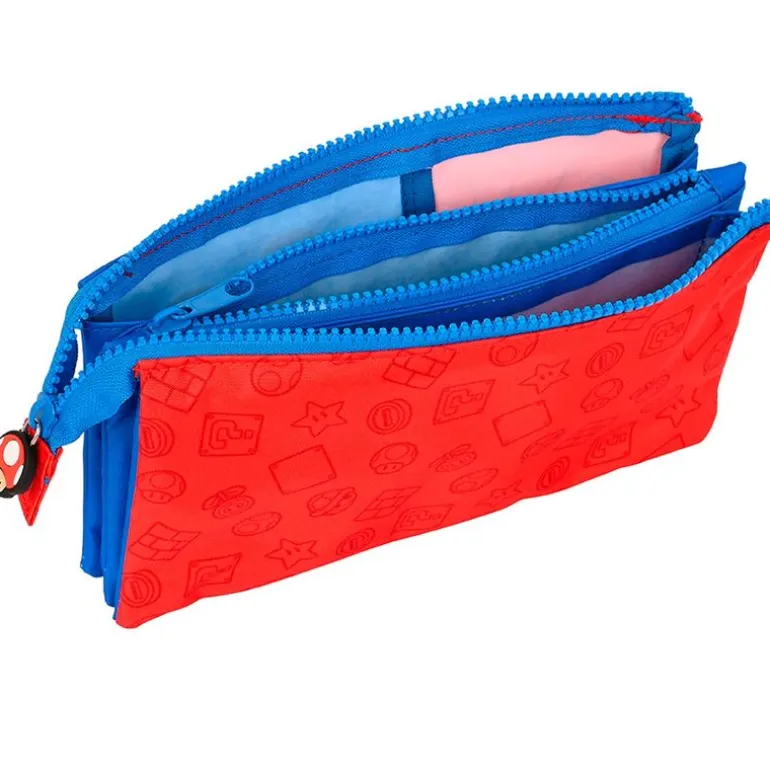 Portatodo con diseños inspirados en el videojuego Super Mario. Dispone de 3 compartimentos diferentes separados con cremallera, para que puedas guardar en el interior tus accesorios escolares. Sus dimensiones son de 22 cm x 3 cm x 12 cm aproximadamente.