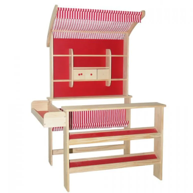Supermercado con estructura de madera en tonos rojo. Ideal para montar tu propia parada de supermercado y disfrutar jugando durante horas.