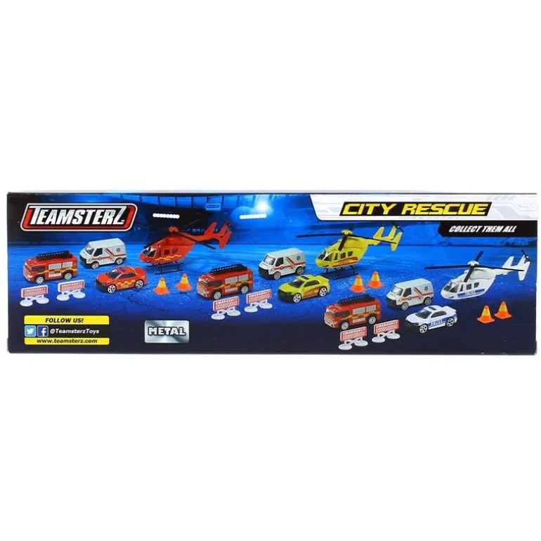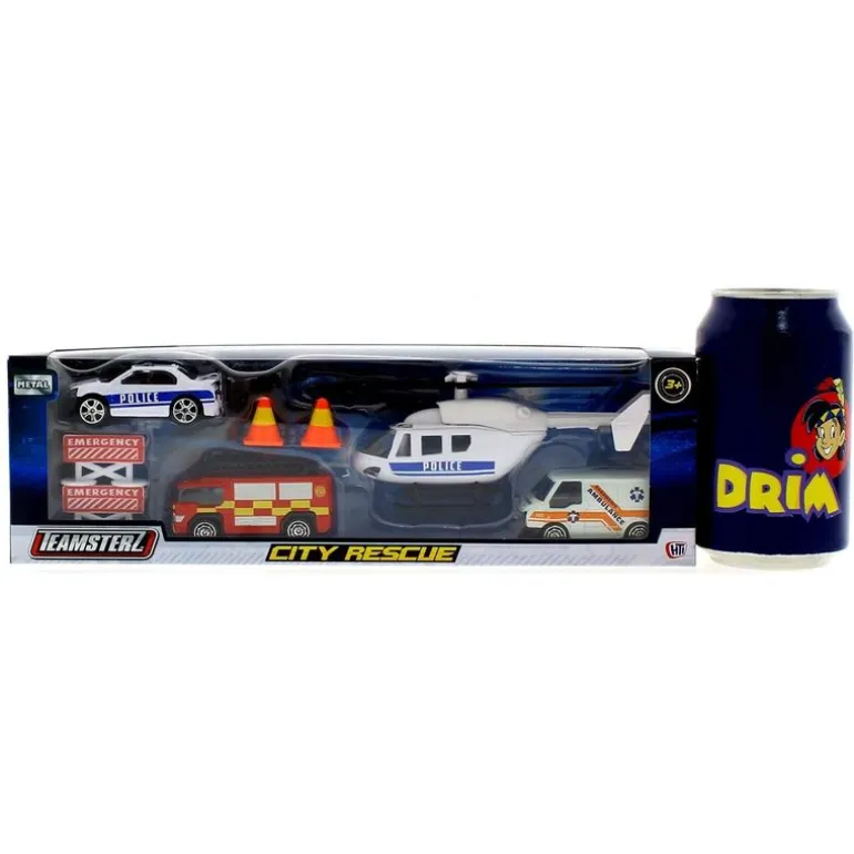 Conjunto de vehículos de emergencia blancos. En el interior encontrarás un helicóptero, una ambulancia, un camión de bomberos, un vehículo y señales de tráfico. Los vehículos están fabricados en metal. Recomendado a partir de 3 años.