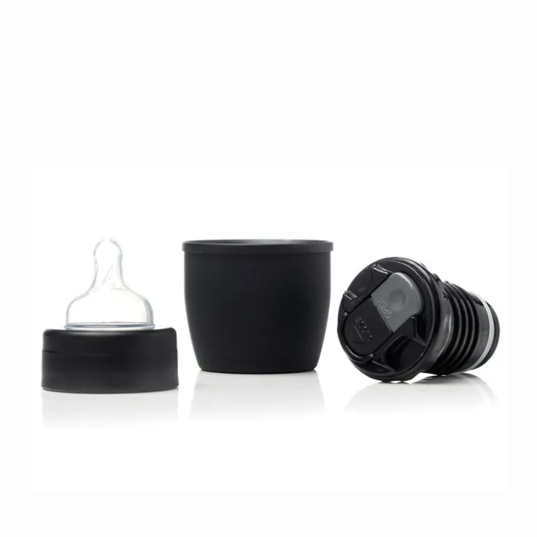 Termo para líquidos de 300 Ml de acero inoxidable de boca ancha con válvula de líquidos que se bloquea por pulsación. Incluye una tetina de silicona para poder usarlo de biberón