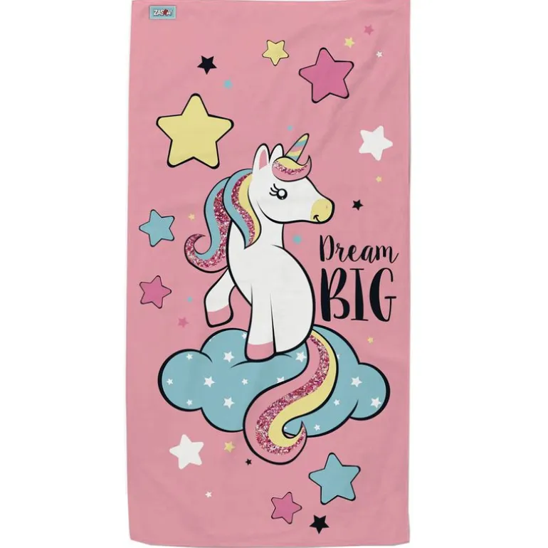 Tiene un llamativo diseño, con fondo en color rosa y con estampaciones de estrellas de colores. Incluye decoraciones como la frase hecha ‘Dream Big’ y con un gran unicornio en su parte central, subido en una esponjosa nube.