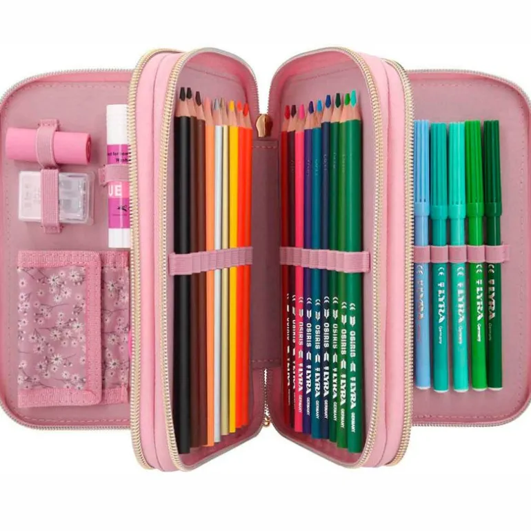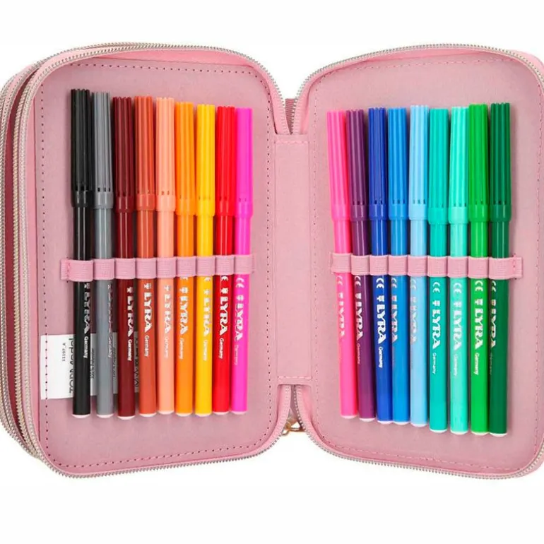 Estuche triple lleno de la colección TOP MODEL. En el interior encontrarás 18 lápices de colores, 18 rotuladores de colores, un lápiz grueso, un lápiz fino, un sacapuntas, una goma, una barra de pegamento, unas tijeras, una regla de 15 cm, una escuadra y un espejo.