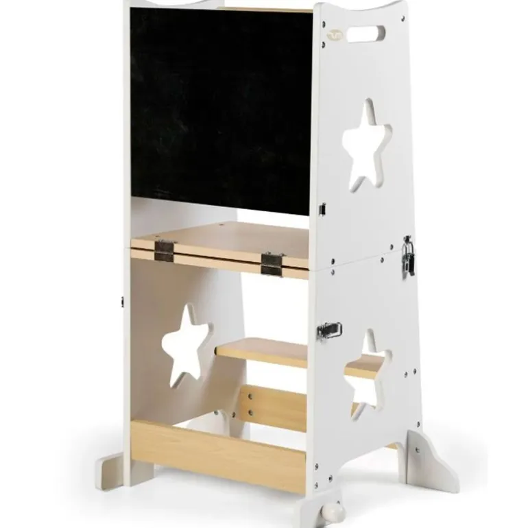 La torre 3 en 1, además de ser una torre se puede transformar en escritorio con asiento. Incluye una pizarra de tiza, ideal para que el niño pueda pintar o escribir.