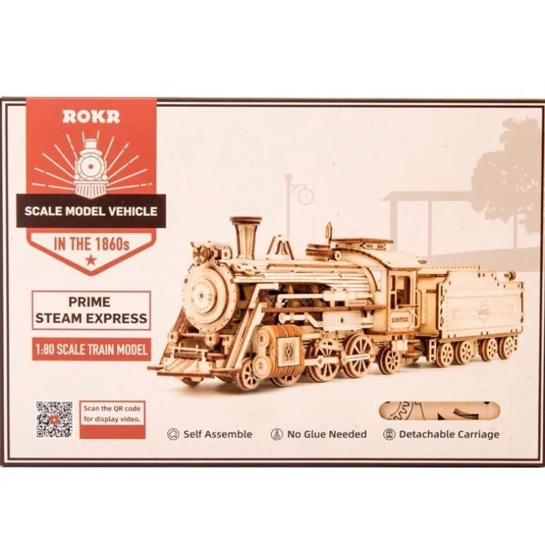 Maqueta de madera compuesta de 308 piezas con las que podrás construir un tren express de vapor.