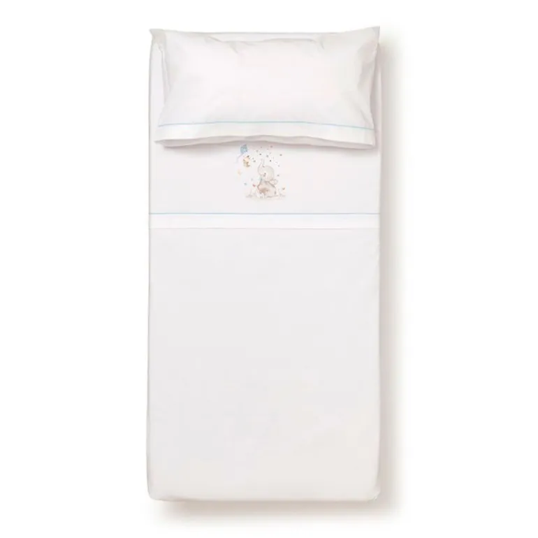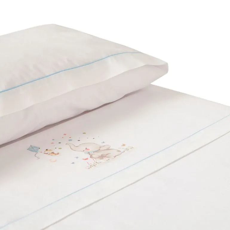 Tríptico de sábanas en algodón, con la bajera en color liso, mientras que la sábana encimera muestra el estampado de un divertido dibujo