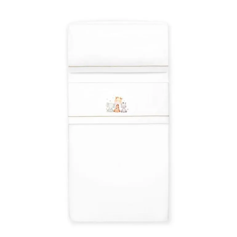 Tríptico de sábanas en algodón, con la bajera en color liso, mientras que la sábana encimera muestra el estampado de un divertido dibujo