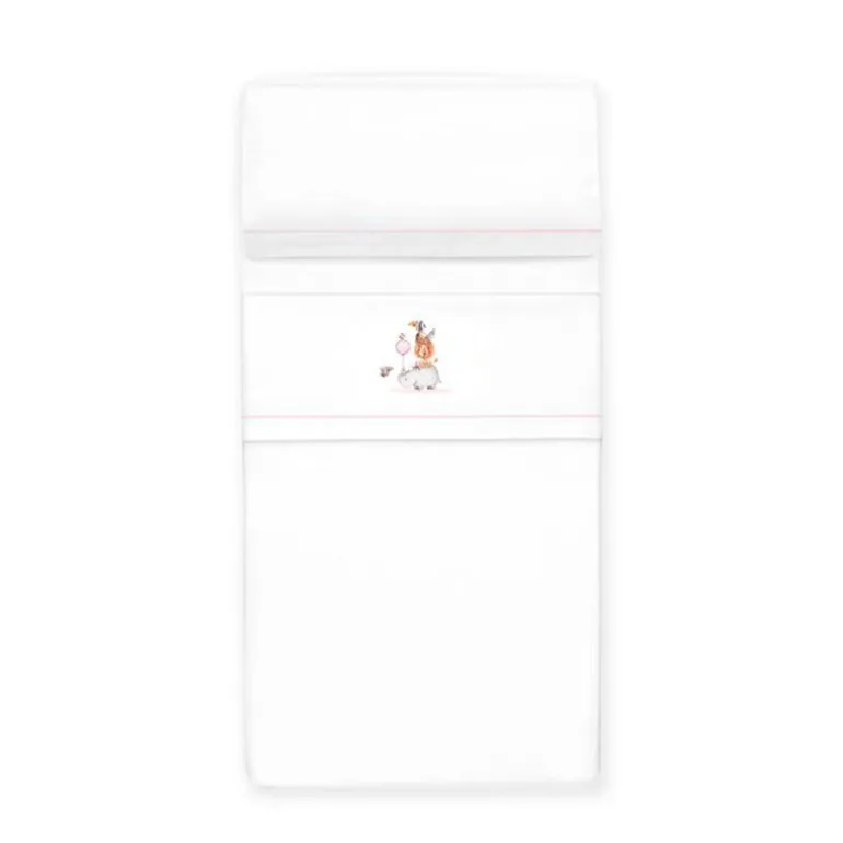 Tríptico de sábanas en algodón, con la bajera en color liso, mientras que la sábana encimera muestra el estampado de un divertido dibujo