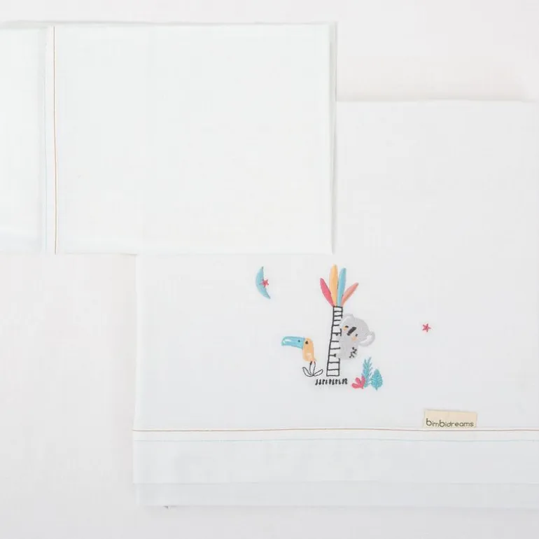 Tríptico de sábanas en algodón, con la bajera en color liso, mientras que la sábana encimera muestra el estampado de un divertido dibujo