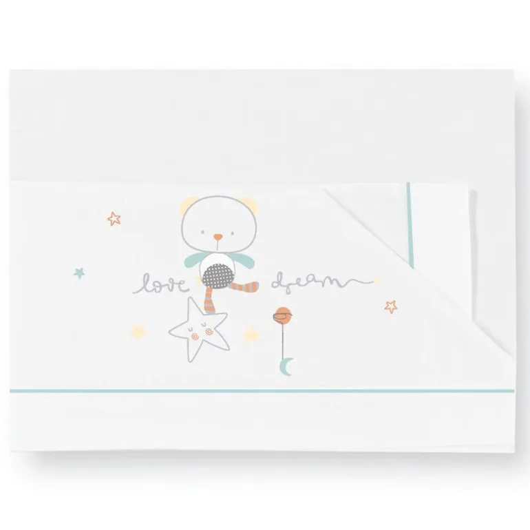 Tríptico de sábanas en algodón, con la bajera en color liso, mientras que la sábana encimera muestra un divertido estampado