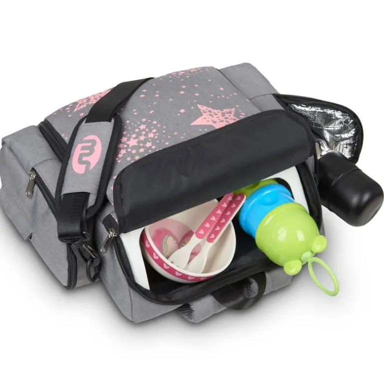Trona elevador con estructura interior rígida que nos hace la función de trona portátil y bolso. Con un compartimento para guardar todo lo necesario para la comida del bebé, Y 2 bolsillos laterales para poder guardar toallitas o bien el biberón.