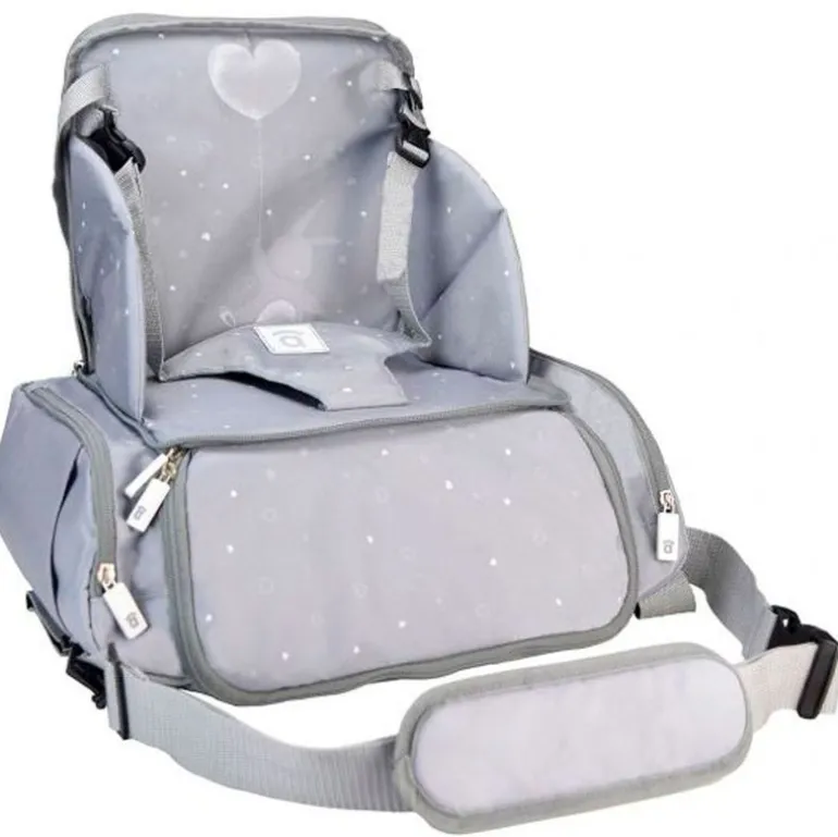 Trona elevadora con estructura interior rígida que hace la función de trona portátil y bolso. Con un compartimento para guardar todo lo necesario para la comida del bebé.