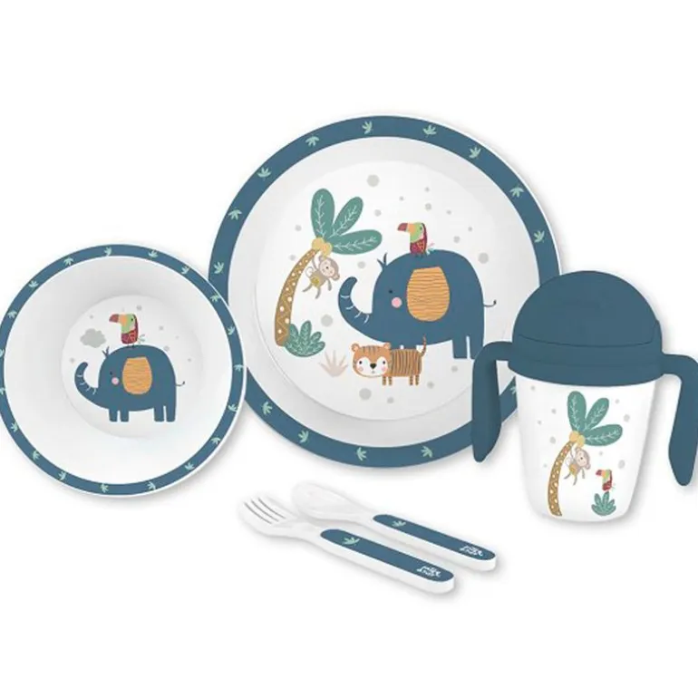 Vajilla formada por 5 piezas para iniciar a tú bebé en la transición de la comida sólida. Este set se compone por un plato llano, un bol, un juego de cuchara y tenedor con las puntas redondeadas y un vaso de entrenamiento con boca ergonómica antigoteo. Cuando el niño se haga mayor, se puede utilizar sin la tapa.