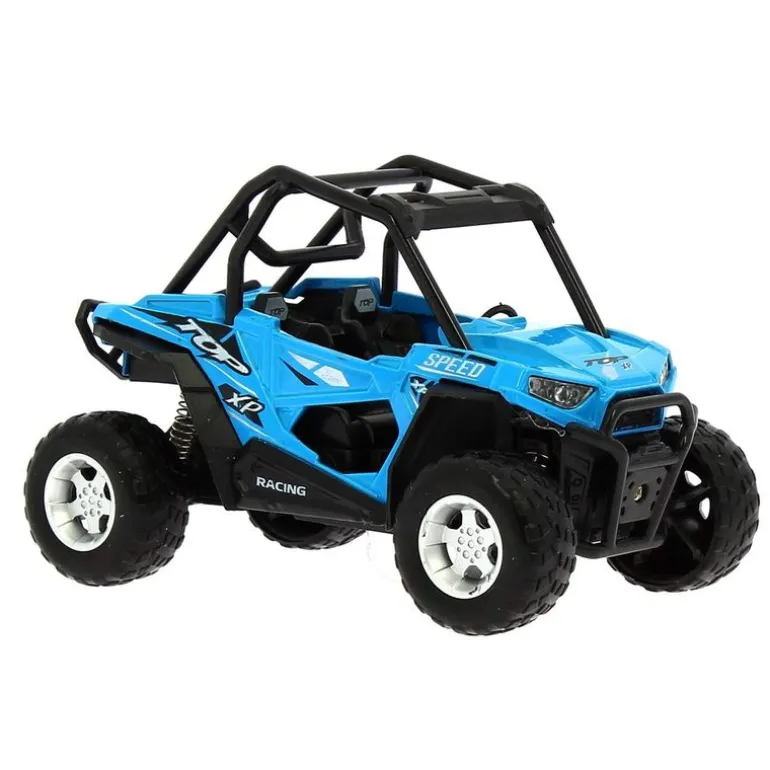 Vehículo Cross Country de color azul. Hecho de metal y con una escala de 1:22. Reproduce sonidos y luces. Funciona con sistema de fricción. Recomendado a partir de 3 años.