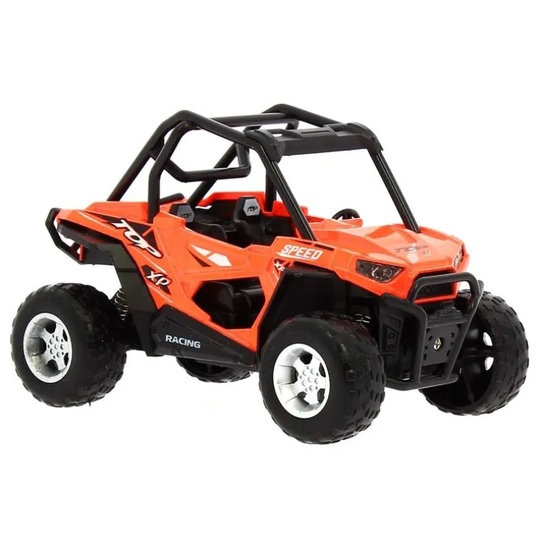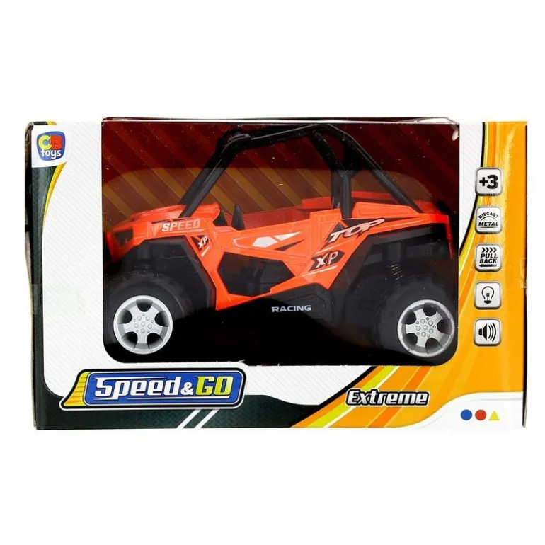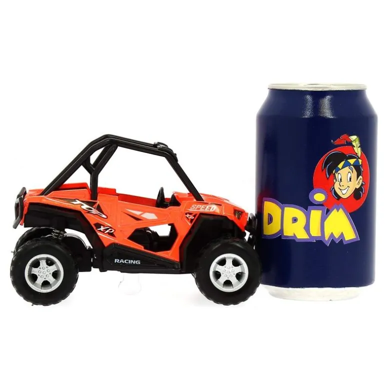 Vehículo Cross Country de color rojo. Hecho de metal y con una escala de 1:22. Reproduce sonidos y luces. Funciona con sistema de fricción. Recomendado a partir de 3 años.