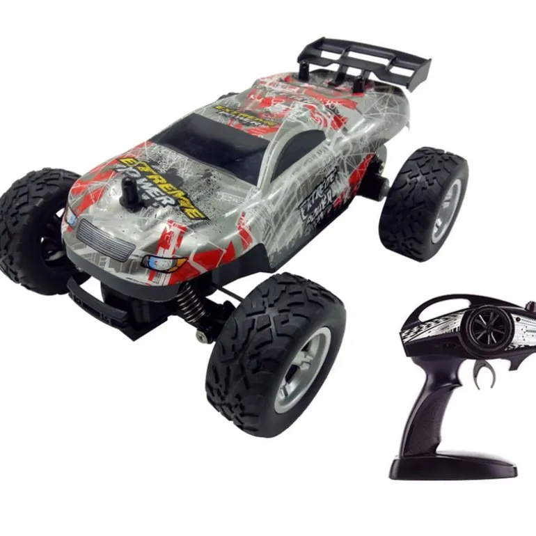 Vehículo de tipo Monster Truck con grandes ruedas. Su escala es de 1:24 y podrás controlarlo en diferentes direcciones gracias al mando en forma de pistola.El mando funciona con 2 pilas AA (NO incluidas) y el coche con 4 pilas AA (NO incluidas).