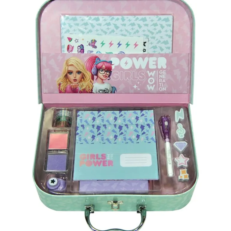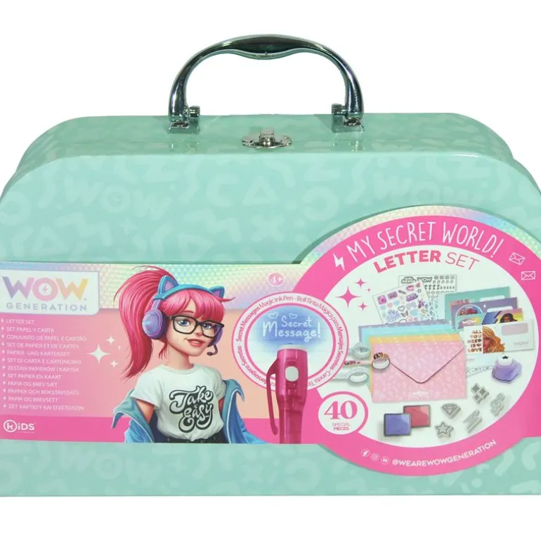 Maletín de la colección WOW Generation en el que encontrarás más de 40 accesorios con los que podrás escribir y decorar tus propias cartas. Contiene hojas decoradas al estilo WOW, postales personalizadas, sobres WOW Generation, 3 cintas de washi tape, un mini troquelador decorativo, 5 stampers de formas, 2 tintas de colores para los stampers, 2 hojas de pegatinas, y un bolígrafo de tinta mágica. Recomendado a partir de 4 años.
