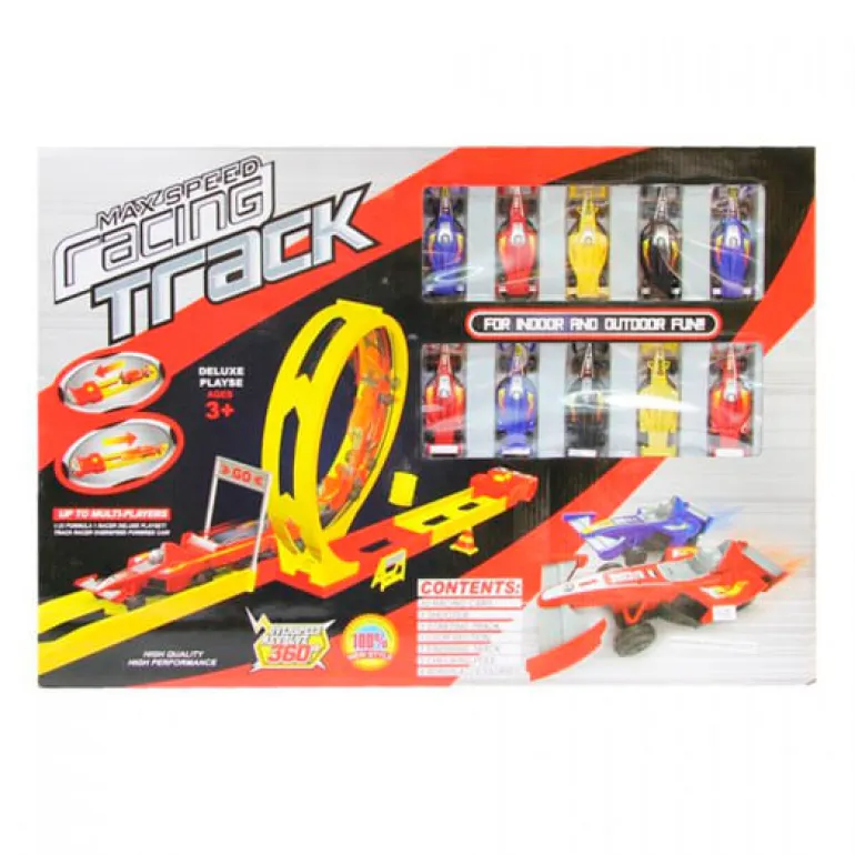 Circuito con 10 modelos diferentes de coches de carreras incluidos. La pista dispone de un looping de 360 grados.
